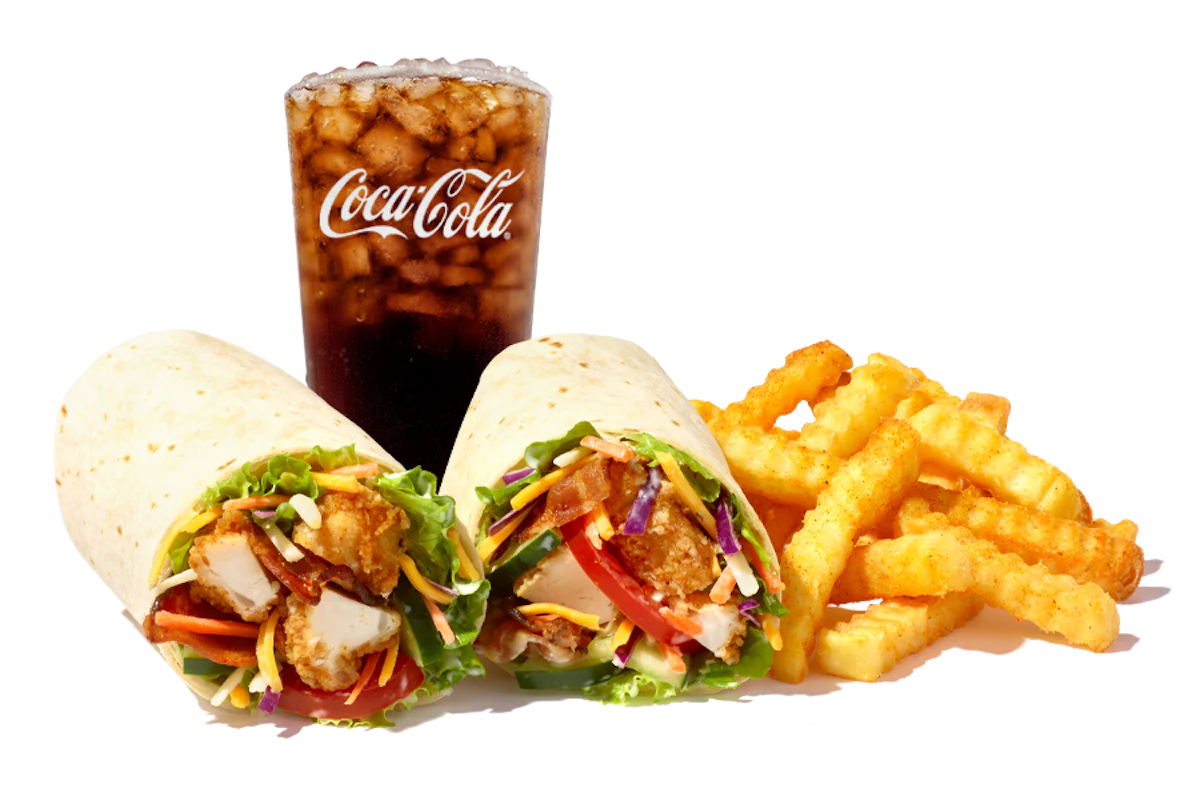 A Giant Chicken Finger Wrap with 3 hand-breaded Chicken Fingerz™, mixed greens with carrots and red cabbage, Cheddar Jack cheese, natural hardwood smoked bacon, cucumbers, tomatoes, and a drizzle of Ranch wrapped in a flour tortilla. Served with Crinkle Fries and Small Drink. Also available with Grilled Chicken.