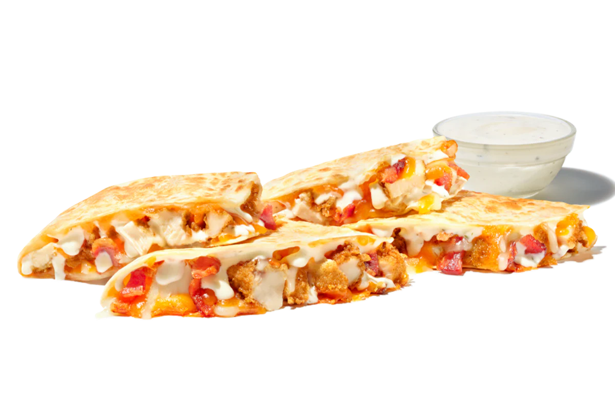 A Giant Quesadilla packed with 3 hand-breaded Chicken Fingerz™, Cheddar Jack cheese, hardwood smoked bacon and Ranch on a flour tortilla. Served with Ranch and Small Drink.