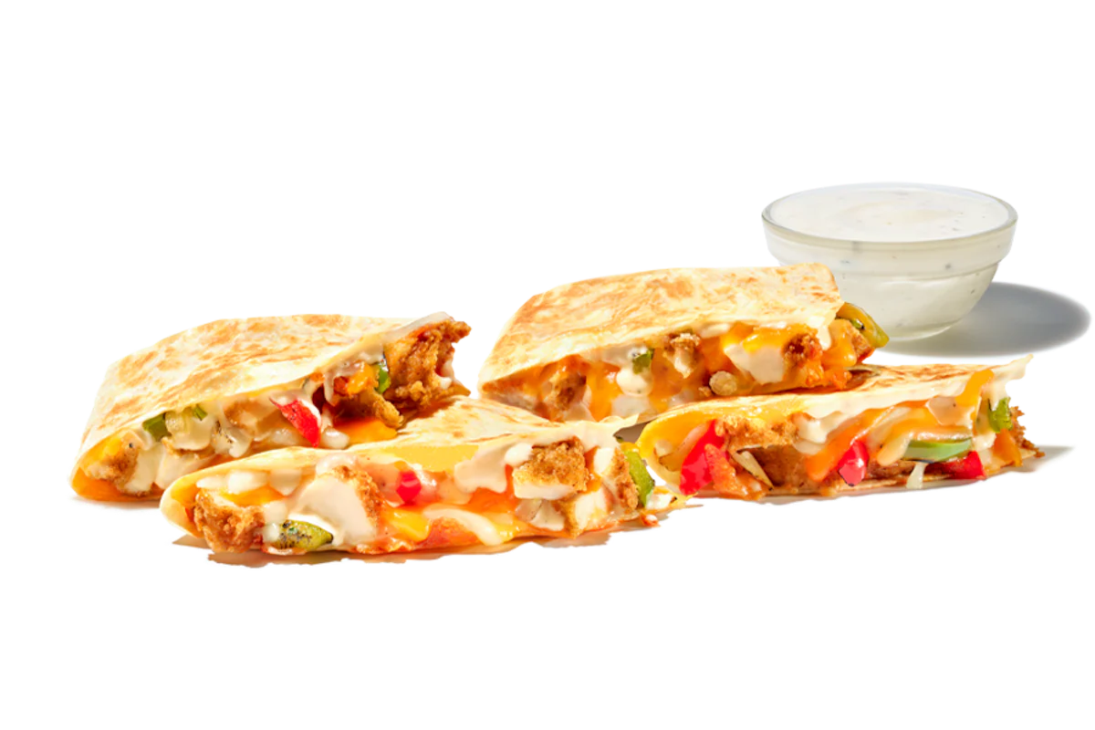 A Giant Quesadilla packed with 3 hand-breaded Chicken Fingerz™, Cheddar Jack cheese, grilled onions and peppers, and Southwest Ranch on a flour tortilla. Served with Ranch and Small Drink.